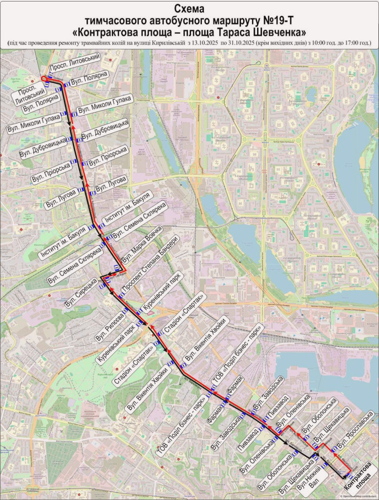 Для зручності пасажирів буде організовано тимчасовий автобусний маршрут № 19-Т від Контрактової площі до площі Тараса Шевченка: