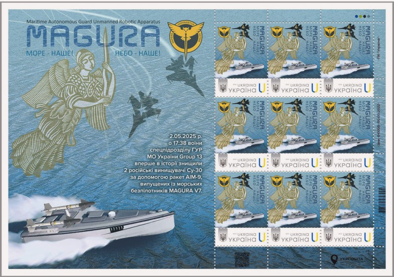 'Укрпошта' представила нову марку під назвою 'MAGURA. Небо наше. Море наше' у зв'язку із знищенням двох ворожих літаків Су-30, що стали жертвами українських морських дронів.