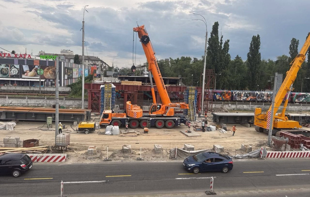 Спеціалісти компанії «Київавтодор» в даний час здійснюють роботи з укладання балок між опорами 1 та 2, що проходять над лінією метрополітену.