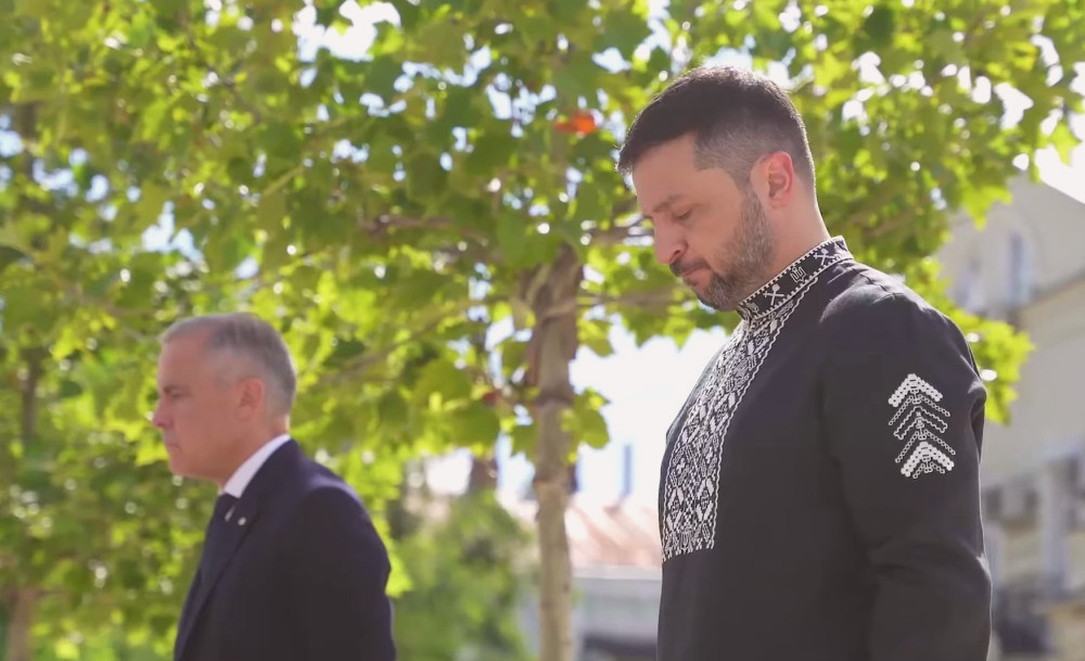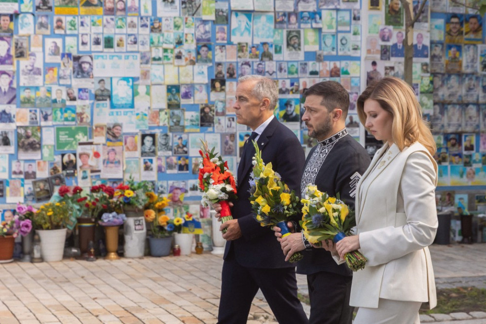 Президент України Володимир Зеленський разом з першою леді Оленою Зеленською та прем’єр-міністром Канади Марком Карні вшанували пам’ять загиблих захисників на Стіні пам’яті в Києві.