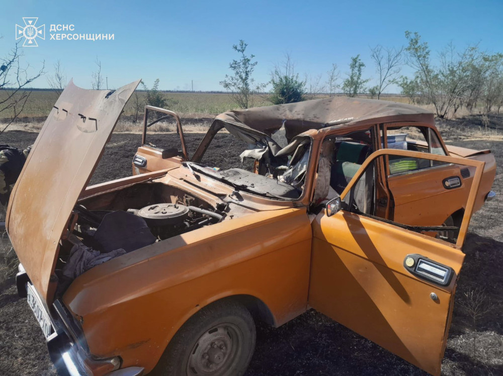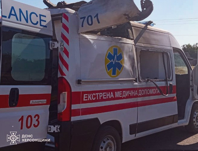 У Бериславському районі ворожий дрон влучив у легковий автомобіль, внаслідок чого загинула одна людина, а ще одна жінка отримала поранення. Рятувальники витягли загиблого та доставили потерпілу до медичного закладу. Окрім цього, удар по кареті швидкої допомоги спричинив пожежу, яку ліквідували пожежники.